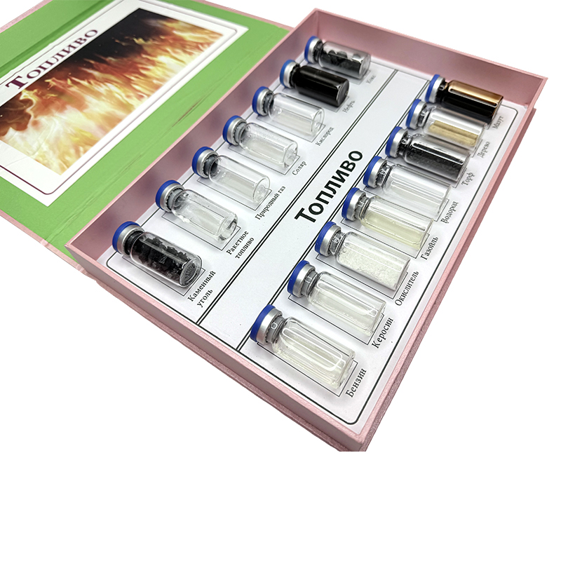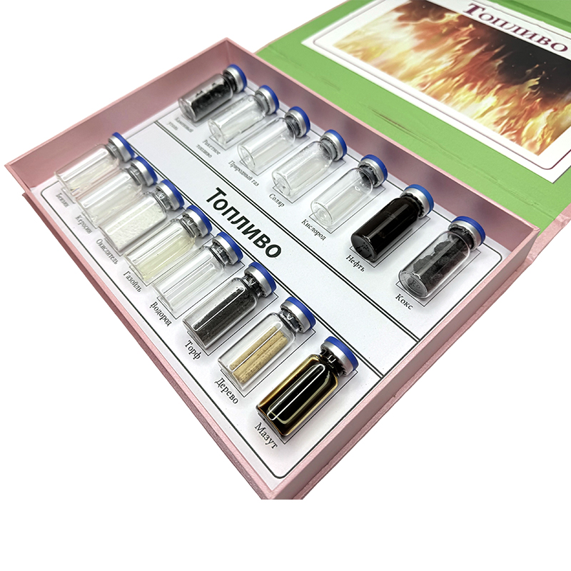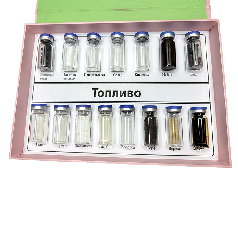 Состоит из 15 образцов топлива, включая природный газ, кислород, нефть, бензин, керозин, окислитель, водород, торф и т. Д.
