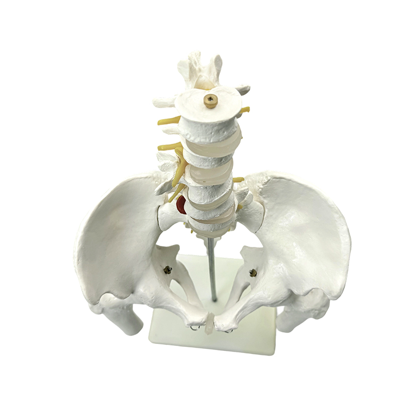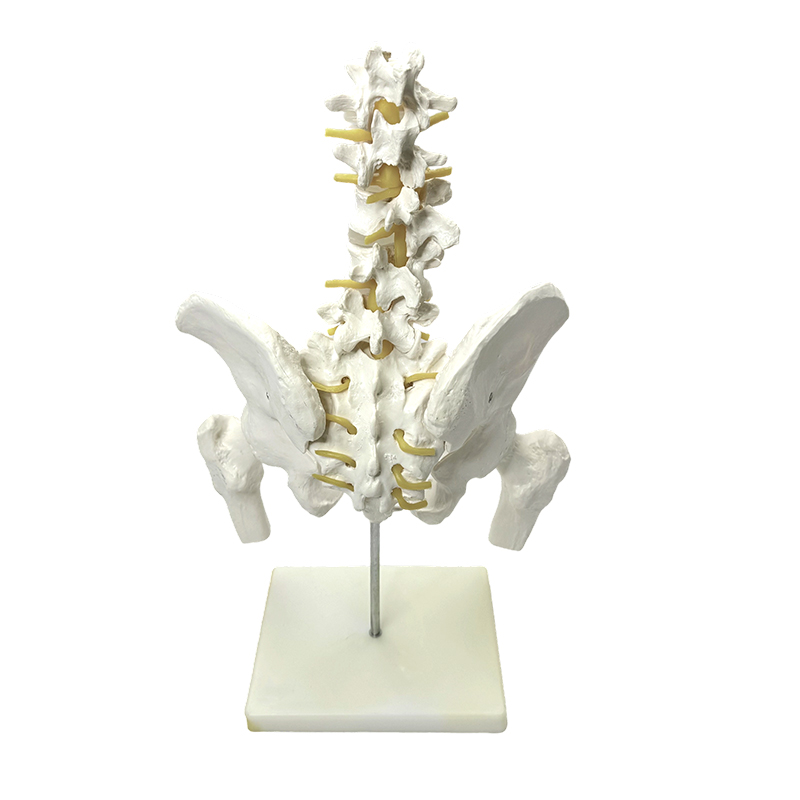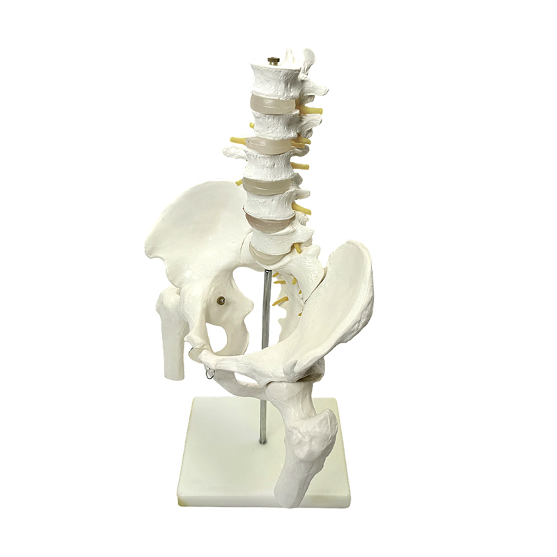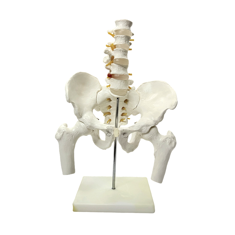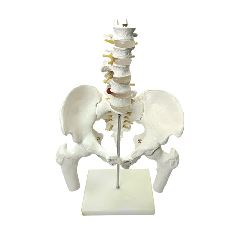 Модель включает в себя тазобедренную кость, крестцы, копья, бедренную кость и пять поясничных позвонков с демонстрацией поясничного диска.