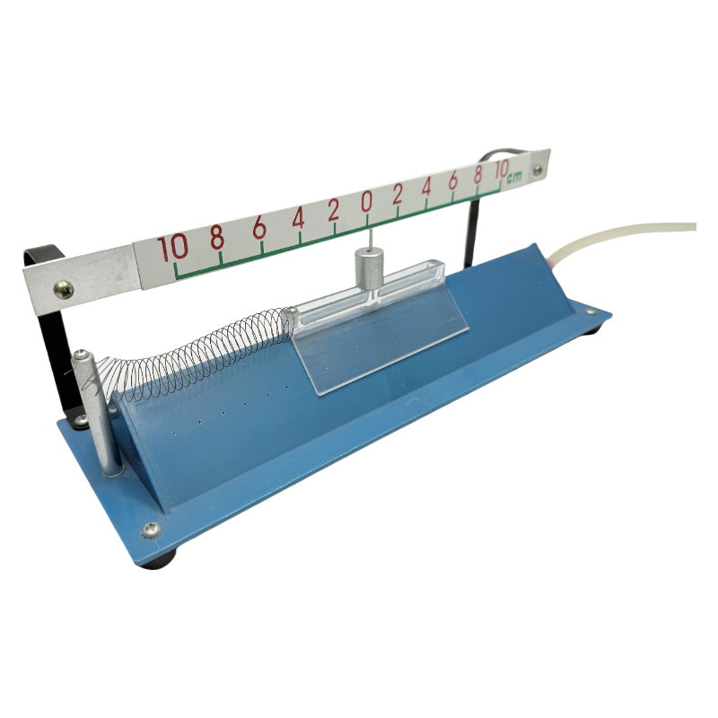 Устройство воздушной подушки предназначено для изучения простого гармонического движения. Воздушная железная железа помогает уменьшить трение и позволяет учащимся точно определять взаимосвязь между периодом колебаний и массой генератора. Устройство также может быть использовано для демонстрации преобразования между динамикой и потенциальной энергией, а также ослабления колебаний из -за трения воздуха.