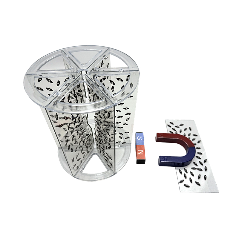 Когда в центре помещают магнит или подковообразный магнит, небольшой указатель намагничен под действием магнитного поля. Два конца указателя формы n полюсов и полюсов соответственно. Под действием силы магнитного поля они распоряжаются трехмерной формой линии магнитного потока.